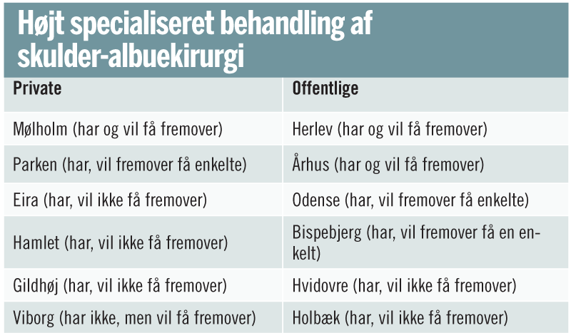 Alt for få operationer Dansk Selskab for skulder- og albuekirurgi vil gerne rådgive om, hvilke af privathospitalerne i Danmark der kan levere et højt behandlingsniveau på de mere specielle områder.